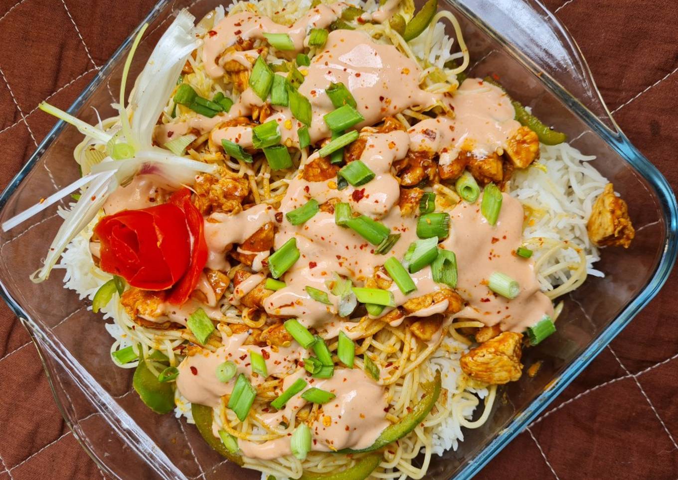 Layer rice, noodles, chicken and sauce.garnish and serve
